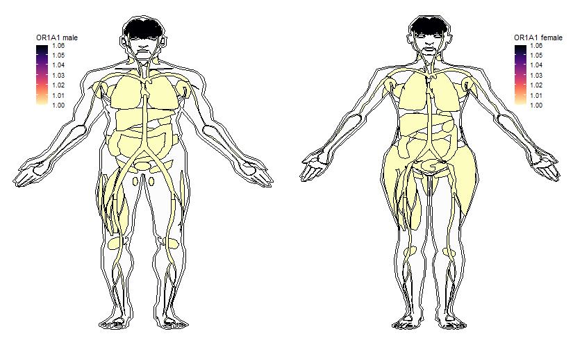 Ectopic expression of some Receptors in a variety of tissues was drawn using R gganatogram package, based on a comprehensive expression analysis with Next Generation Sequencing (NGS) technique (View more). Expression data are taken from the table-Expression profile of all genes in 16 different human tissues. Original values are added by one to show a log10 transformed profile.