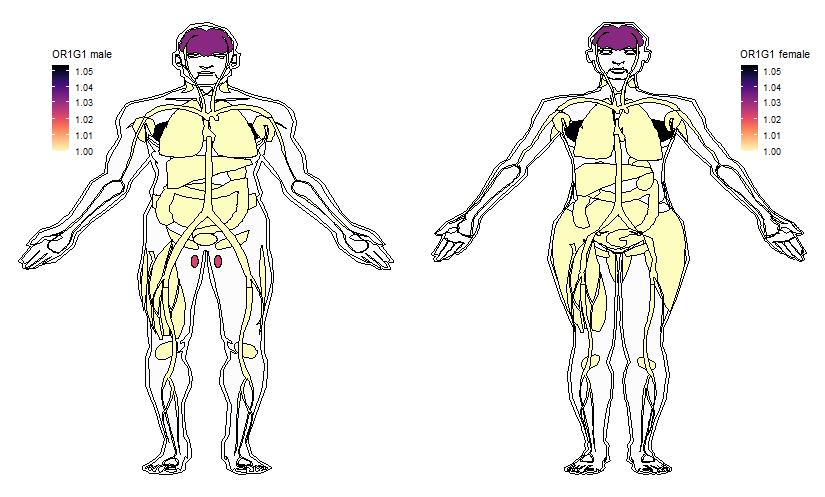 Ectopic expression of some Receptors in a variety of tissues was drawn using R gganatogram package, based on a comprehensive expression analysis with Next Generation Sequencing (NGS) technique (View more). Expression data are taken from the table-Expression profile of all genes in 16 different human tissues. Original values are added by one to show a log10 transformed profile.