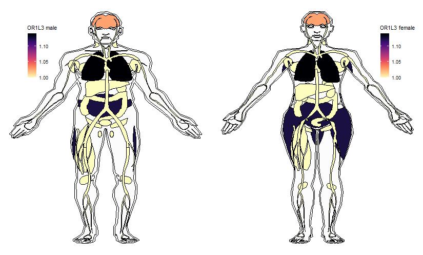 Ectopic expression of some Receptors in a variety of tissues was drawn using R gganatogram package, based on a comprehensive expression analysis with Next Generation Sequencing (NGS) technique (View more). Expression data are taken from the table-Expression profile of all genes in 16 different human tissues. Original values are added by one to show a log10 transformed profile.