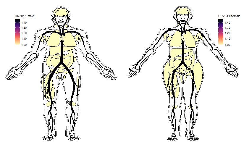 Ectopic expression of some Receptors in a variety of tissues was drawn using R gganatogram package, based on a comprehensive expression analysis with Next Generation Sequencing (NGS) technique (View more). Expression data are taken from the table-Expression profile of all genes in 16 different human tissues. Original values are added by one to show a log10 transformed profile.