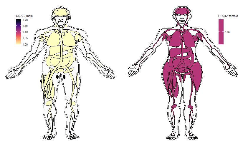 Ectopic expression of some Receptors in a variety of tissues was drawn using R gganatogram package, based on a comprehensive expression analysis with Next Generation Sequencing (NGS) technique (View more). Expression data are taken from the table-Expression profile of all genes in 16 different human tissues. Original values are added by one to show a log10 transformed profile.