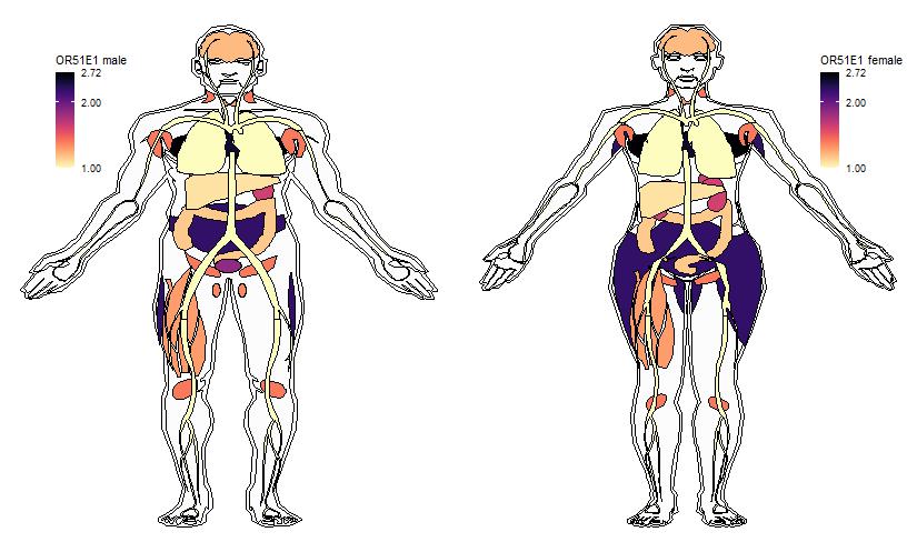 Ectopic expression of some Receptors in a variety of tissues was drawn using R gganatogram package, based on a comprehensive expression analysis with Next Generation Sequencing (NGS) technique (View more). Expression data are taken from the table-Expression profile of all genes in 16 different human tissues. Original values are added by one to show a log10 transformed profile.