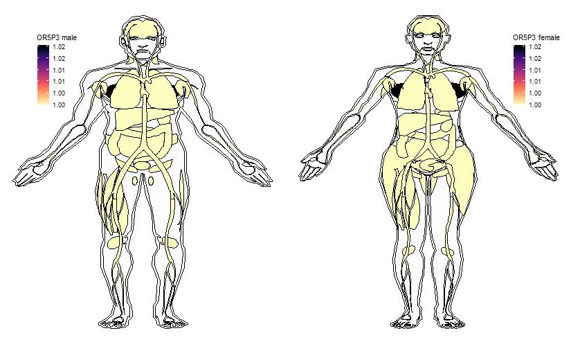 Ectopic expression of some Receptors in a variety of tissues was drawn using R gganatogram package, based on a comprehensive expression analysis with Next Generation Sequencing (NGS) technique (View more). Expression data are taken from the table-Expression profile of all genes in 16 different human tissues. Original values are added by one to show a log10 transformed profile.