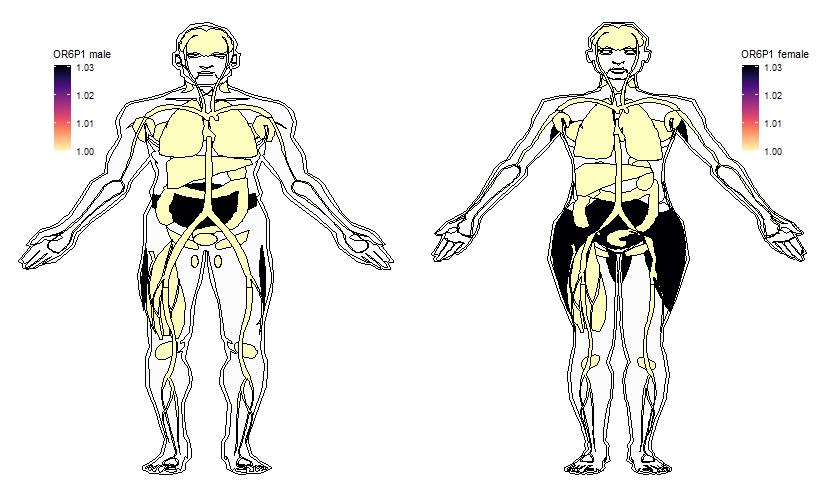 Ectopic expression of some Receptors in a variety of tissues was drawn using R gganatogram package, based on a comprehensive expression analysis with Next Generation Sequencing (NGS) technique (View more). Expression data are taken from the table-Expression profile of all genes in 16 different human tissues. Original values are added by one to show a log10 transformed profile.
