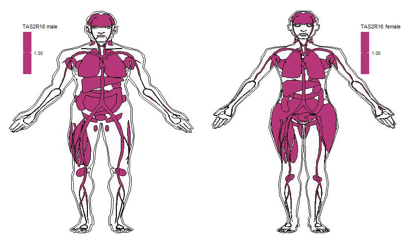 Ectopic expression of some Receptors in a variety of tissues was drawn using R gganatogram package, based on a comprehensive expression analysis with Next Generation Sequencing (NGS) technique (View more). Expression data are taken from the table-Expression profile of all genes in 16 different human tissues. Original values are added by one to show a log10 transformed profile.