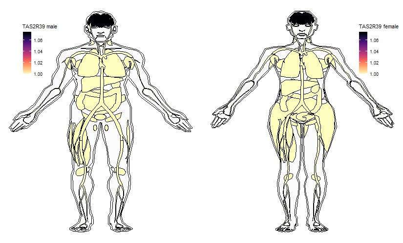 Ectopic expression of some Receptors in a variety of tissues was drawn using R gganatogram package, based on a comprehensive expression analysis with Next Generation Sequencing (NGS) technique (View more). Expression data are taken from the table-Expression profile of all genes in 16 different human tissues. Original values are added by one to show a log10 transformed profile.