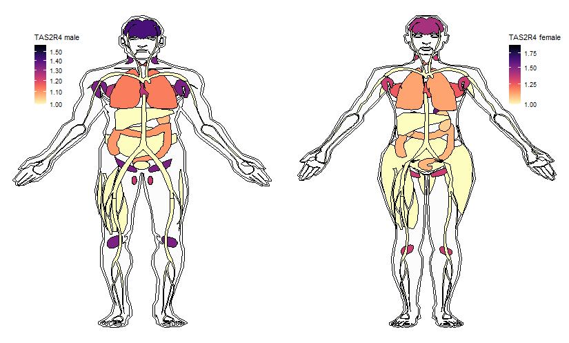 Ectopic expression of some Receptors in a variety of tissues was drawn using R gganatogram package, based on a comprehensive expression analysis with Next Generation Sequencing (NGS) technique (View more). Expression data are taken from the table-Expression profile of all genes in 16 different human tissues. Original values are added by one to show a log10 transformed profile.