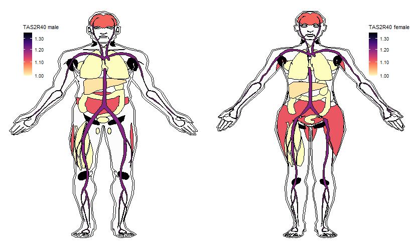 Ectopic expression of some Receptors in a variety of tissues was drawn using R gganatogram package, based on a comprehensive expression analysis with Next Generation Sequencing (NGS) technique (View more). Expression data are taken from the table-Expression profile of all genes in 16 different human tissues. Original values are added by one to show a log10 transformed profile.