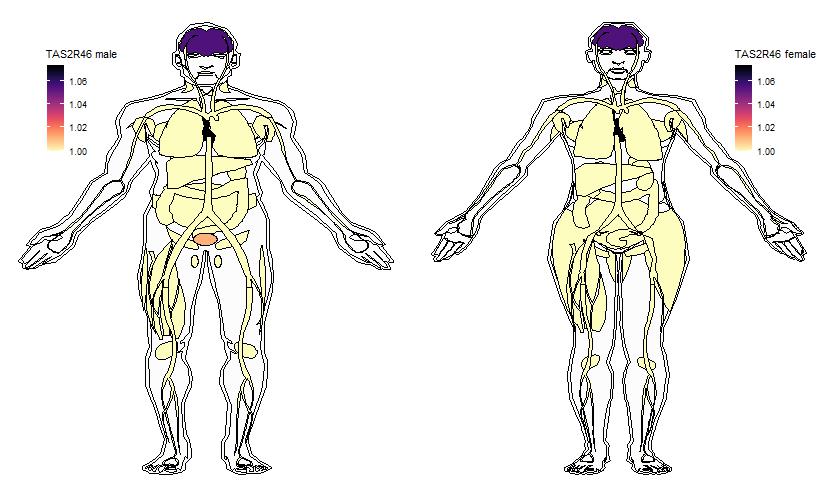 Ectopic expression of some Receptors in a variety of tissues was drawn using R gganatogram package, based on a comprehensive expression analysis with Next Generation Sequencing (NGS) technique (View more). Expression data are taken from the table-Expression profile of all genes in 16 different human tissues. Original values are added by one to show a log10 transformed profile.